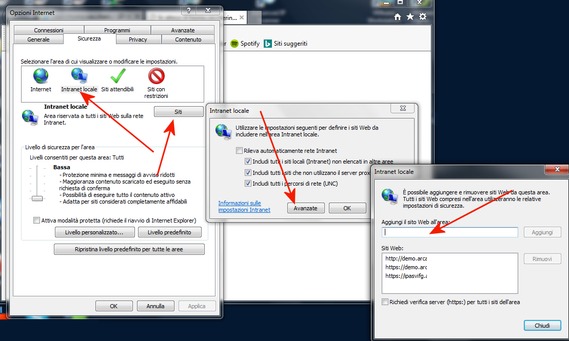 Quando si riceve questo errore, il sito web (attuale) non è stato inserito tra i siti web “Attendibili”. Da Internet Explorer > Opzioni Internet > Intranet Locale > Siti > Avanzate